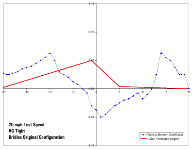 In September of this year, we at Wills Wing conducted a vehicle pitch test series on a HPAT 158 with about 400 hours on it that belongs to a local pilot. When we obtained the glider, the bridles were still at their original factory setting, and we did not adjust them. In our first few pitch test runs, we found that the glider had a positive pitching moment at the VG loose setting, though the pitching moment curve had a few areas where it failed to meet HGMA minimum requirements. At the VG tight setting, the situation was dramatically worse – the glider actually had a negative pitching moment at angles of attack near zero lift. (See the pitching moment graph labeled “20 mph VGT 1.”)
