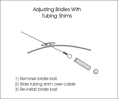 Wills Wing is recommending that all pilots of Wills Wing gliders carefully check their bridles against the proper “just slack” criterion. A Technical Bulletin covering bridle inspection procedures which was first published this past July is posted on our web site (www.www.willswing.com) and is available on request by mail or fax for no charge. Pilots should also consult their owner’s manuals for proper bridle sighting and adjustment procedures. What is not covered in the bulletin or in the owner’s manuals is what we believe is the most convenient method for correcting bridles where the adjustment required is beyond the range provided for by the normal method of raising the bridle ring. We have found that the most effective method to adjust bridles that are grossly out of adjustment due to sail shrinkage is to shim the bridles from below the sail. What is needed is short pieces of tubing which are larger in outside diameter than the hole in the bridle grommet, and smaller in inside diameter than the bridle ball. Pieces of 3/8″ or 10mm batten tubing work well, as will any ½” tubing with .065″ or greater wall thickness. Plastic tubing works fine as there is no significant load on the tubing during the inspection and adjustment process. If you cut pieces to ¼”, ½” and 1″ lengths, you can easily make adjustments in ¼” increments using no more than three shims to obtain up to 2.5″ of adjustment. Wills Wing will provide a supply of these shims to anyone on request through participating Wills Wing dealers. By removing the bridle ball, sliding the tubing shim over the cable below the sail, and re-installing the ball, you can shorten the cable in calibrated amounts. Since it is difficult to sight the bridles accurately in flight unless you have a lot of practice at it, the most accurate way to achieve the “just slack” adjustment is to actually go a little too far, and adjust the bridles to the point of being snug (see the Technical Bulletin for descriptions of how to sight the bridles). Then by backing off ¼ to ½ inch from “snug” you will have “just slack.” Use caution when making these adjustments, because as the bridles become tight, the glider’s handling will deteriorate and the pitch trim will change. Keep in mind that on VG equipped gliders, the “just slack criterion applies to the VG tight setting; at looser VG settings the bridles will be more than “just slack.” Once the proper bridle adjustment is achieved using the shims, the pilot can order through his dealer a custom made replacement bridle set fabricated to the proper dimensions, by specifying the total length of shims used to correct each bridle. Pilots who do not feel comfortable making these adjustments themselves should seek the assistance of their Wills Wing dealer.