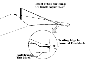 How is it that Roger’s glider re-adjusted itself? It probably did so in several ways; minor stretching of the bottom side wires and seating of the hardware may have allowed a little extra dihedral into the wing, slackening the bridles as the wing “folded upwards” around the axis of the keel. The bridle cables themselves may have stretched slightly. These effects are minor, however, and by themselves would probably not be a problem. Far more significant is the tendency of the sail to shrink over time. As far as we know, this tendency is probably common to all forms of polyester (Dacron) sailcloth. As the drawing illustrates, if the sail shrinks in the spanwise direction, the bridle attachment point moves inwards towards the keel. Since the bridle cable does not also shrink, the trailing edge of the sail is supported at a significantly lower height. For a bridle attached far outboard on the wing, the sail can be lowered as much as five times the amount that the sail shrinks. Outboard bridle locations are a more effective way of adding pitch stability on high aspect ratio flex wings than inboard bridles because with a short root chord reflex is not as effective as the support of a large portion of the swept back part of the wing. However, outboard bridles also magnify the problem of the shrinkage effect in two ways. The more shallow cable angle increases the amount of trailing edge lowering for a given amount of sail shrinkage, and a given percentage of shrinkage translates to a greater amount of shrinkage over the longer span to an outboard bridle location.