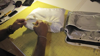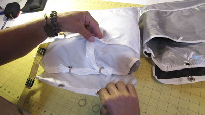 The next steps involve transferring your parachute into the Covert D-bag. Below is a series of photos documenting the process. It’s helpful to have 4 spare rubber bands on hand for the transfer process. The canopy of your parachute should be accordion in a width to fit by filling out the main compartment of the Covert D-bag as proportionately as possible. If done properly, the chute should be as flat and as wide as the bag allows.