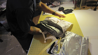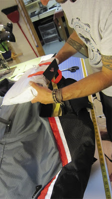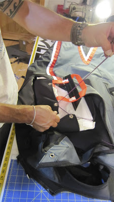 When the entire bridle is stored properly in the recessed area within the chute storage space, lay the parachute (in it’s Covert Deployment bag) on top of the bridle and in between the neoprene flaps that will secure your chute. Make sure the handle and deployment “paddle” are facing up and in the correct orientation (see photo).