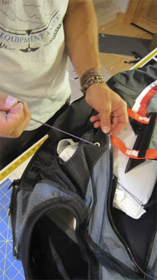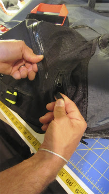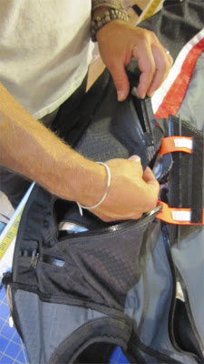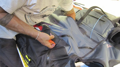 Your next job is to zip up the harness chute doors. There are two #10 zipper gliders included with your Covert. You can find them in the top pocket of your harness bag. Take one of these zipper gliders and start by zipping up the door zipper that point toward your hip (if wearing the harness). Note: Make sure the paddle and chute handle are outside of the harness when the doors get zipped. Start at the handle side of the zipper. With the zipper glider facing down (or, inside the harness) thread the glider onto the zipper. Be patient and take the time necessary to line up the angle of the zipper so that it matches (see photo). If they are not aligned, there will be a wrinkle or pleat in the harness shell. Once aligned, zip the glider all of the way down the zipper, under the neoprene “hood” and off the end of the zipper. You can reach inside the shell to remove the zipper glider off of the end of the zipper. Next, repeat this process on the zipper that closes toward the center of your back. The best way to reach in to pull off the glider from the end of that zipper is to reach inside the harness through the main riser slot (behind your main). Next, repeat again with the zipper that closes toward the aero tow loop access zipper. You complete the process by pulling the zipper glider off the end of that zipper through the aero tow loop access.