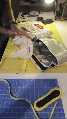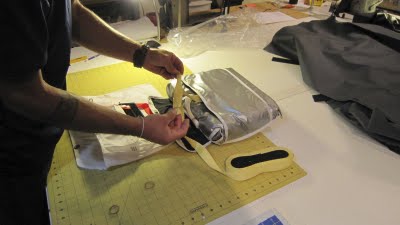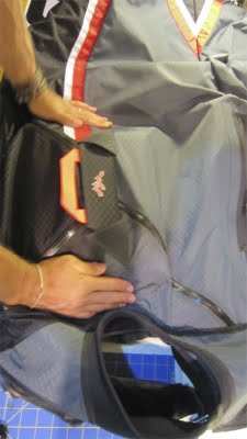 When the entire bridle is stored properly in the recessed area within the chute storage space, lay the parachute (in it’s Covert Deployment bag) on top of the bridle and in between the neoprene flaps that will secure your chute. Make sure the handle and deployment “paddle” are facing up and in the correct orientation (see photo).