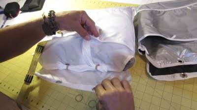 Now you have access to remove your canopy from the old d-bag’s main container and carefully place it back in to the main compartment on the LARA style COVERT D-bag. Next, remove the shroud bundle and swivel from the old D-bag and replace in the corresponding shroud pocket in the COVERT D-bag.