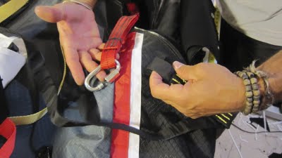 As a last step, if necessary, reach in through the riser slot again (behind your main) and use your fingers to carefully pull all of the excess webbing (orange) from the chute handle to inside the harness so that the paddle can lay completely flat and to allow the paddle to be properly secured with the Velcro on and under the paddle. When you’re satisfied with the installation, pull the strings from the bungee loops to complete the installation.