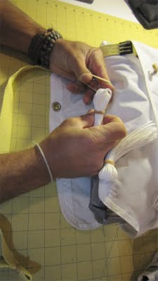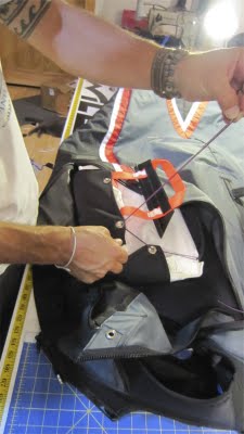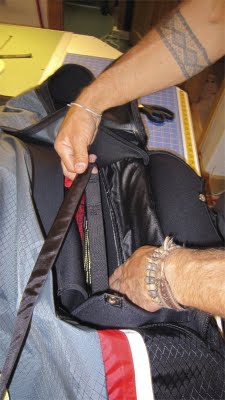 Now, all of the chute door zippers are properly closed and your handle and deployment paddle are outside of the harness, along with the strings exiting the grommets on either side of the handle. One at a time, pull the string with enough force to see the bungy stretched outside of the exit grommet. With the bungy loop pulled out of the harness, thread the nylon rod (sewn to the handle “paddle”) through the bungy loop to secure the neoprene flaps inside the harness. At the same time, tuck the corresponding side of the “paddle” under its triangular capture that is sewn onto the exterior of the harness (see photo). Repeat this process to the other side.