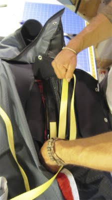 Your chute is now installed properly. It is helpful to flip the harness over and make sure the bridle is contained in the recessed area. I like to hang in the harness at this point as well. This starts the process of getting the chute to conform around your body and to make sure the quick link isn’t out of position causing discomfort. It’s been my experience that after about 10 hours in the harness, the chute will be nicely conformed to your body shape and increase the overall comfort of the harness.