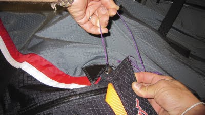 Your next job is to zip up the harness chute doors. There are two #10 zipper gliders included with your Covert. You can find them in the top pocket of your harness bag. Take one of these zipper gliders and start by zipping up the door zipper that point toward your hip (if wearing the harness). Note: Make sure the paddle and chute handle are outside of the harness when the doors get zipped. Start at the handle side of the zipper. With the zipper glider facing down (or, inside the harness) thread the glider onto the zipper. Be patient and take the time necessary to line up the angle of the zipper so that it matches (see photo). If they are not aligned, there will be a wrinkle or pleat in the harness shell. Once aligned, zip the glider all of the way down the zipper, under the neoprene “hood” and off the end of the zipper. You can reach inside the shell to remove the zipper glider off of the end of the zipper. Next, repeat this process on the zipper that closes toward the center of your back. The best way to reach in to pull off the glider from the end of that zipper is to reach inside the harness through the main riser slot (behind your main). Next, repeat again with the zipper that closes toward the aero tow loop access zipper. You complete the process by pulling the zipper glider off the end of that zipper through the aero tow loop access.