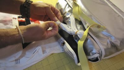 Then, take the butterfly’d shrouds and secure the first cover flap by reattaching them to the bag with the rubber bands on the COVERT D-bag. Then, close the main closure flap by pulling the last two rubber bands through the grommets and securing the first fold of the bridle. Remember to remove the spare rubber bands that you placed to keep things organized during the transfer.