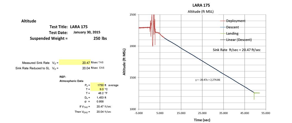 The LARA 250 was drop tested eight times by the United States military. Data was gathered at the rate of five samples per second utilizing a SOMAT data logger with on-board altimeter instrumentation. The average descent rate (corrected to sea level) with a 200 pound payload was only 17.5 feet per second! The US military uses 24 feet per second as a maximum allowable descent rate for emergency reserve parachutes. This low descent rate is comparable to the 24 gore PDA being manufactured by Free Flight Enterprises for tandem use.