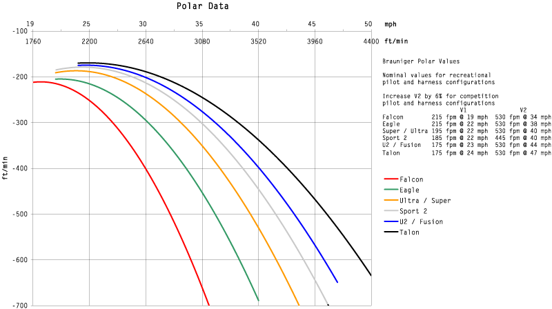 Nominal values for use with Brauniger flight instruments, for recreational pilot and harness configurations. Increase V2 mph by 6% for performance tuning and harness configurations.