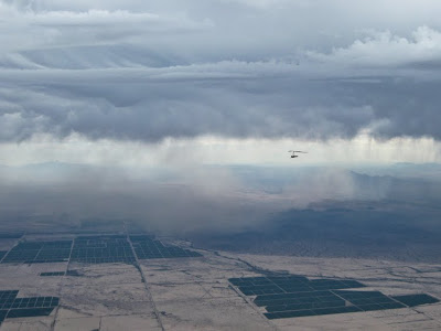 I was running for the big mountains left of course still kind of in the sun. I was sure they would be working. Belinda got on the radio and mentioned the task had been stopped. I was bummed. We were never in danger. I signaled to Barker the task was called and everyone turned around. We thought about trying to fly back to the resort, but the gust front was closer from where we came.
